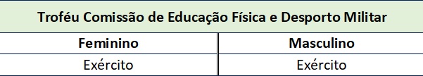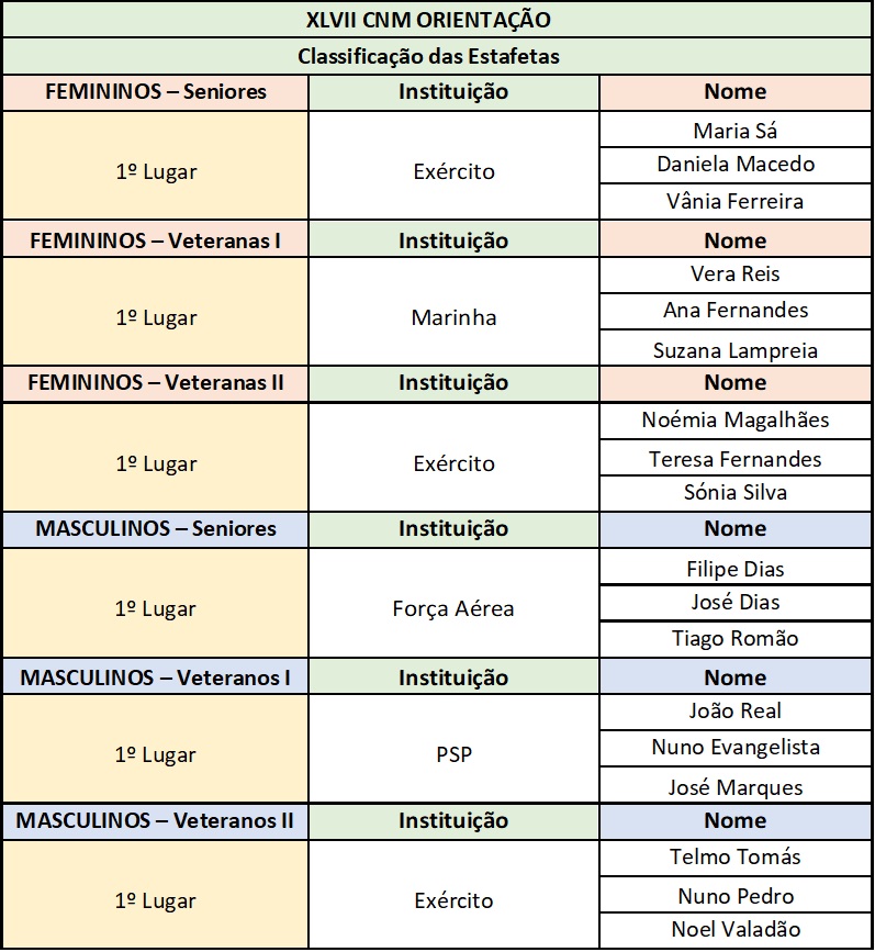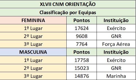 Das classificações obtidas nos 2 percursos individuais, destaca-se o 1.º lugar conquistado por Irina Soares e Tiago Romão, nos escalões D/H21, respetivamente. Por equipas, o Exército venceu tanto os femininos como os masculinos, tendo também vencido 3 das 6 estafetas, o que lhe permitiu arrecadar os dois troféus Comissão de Educação Física e Desporto Militar, bem como o Troféu Federação Portuguesa de Orientação.